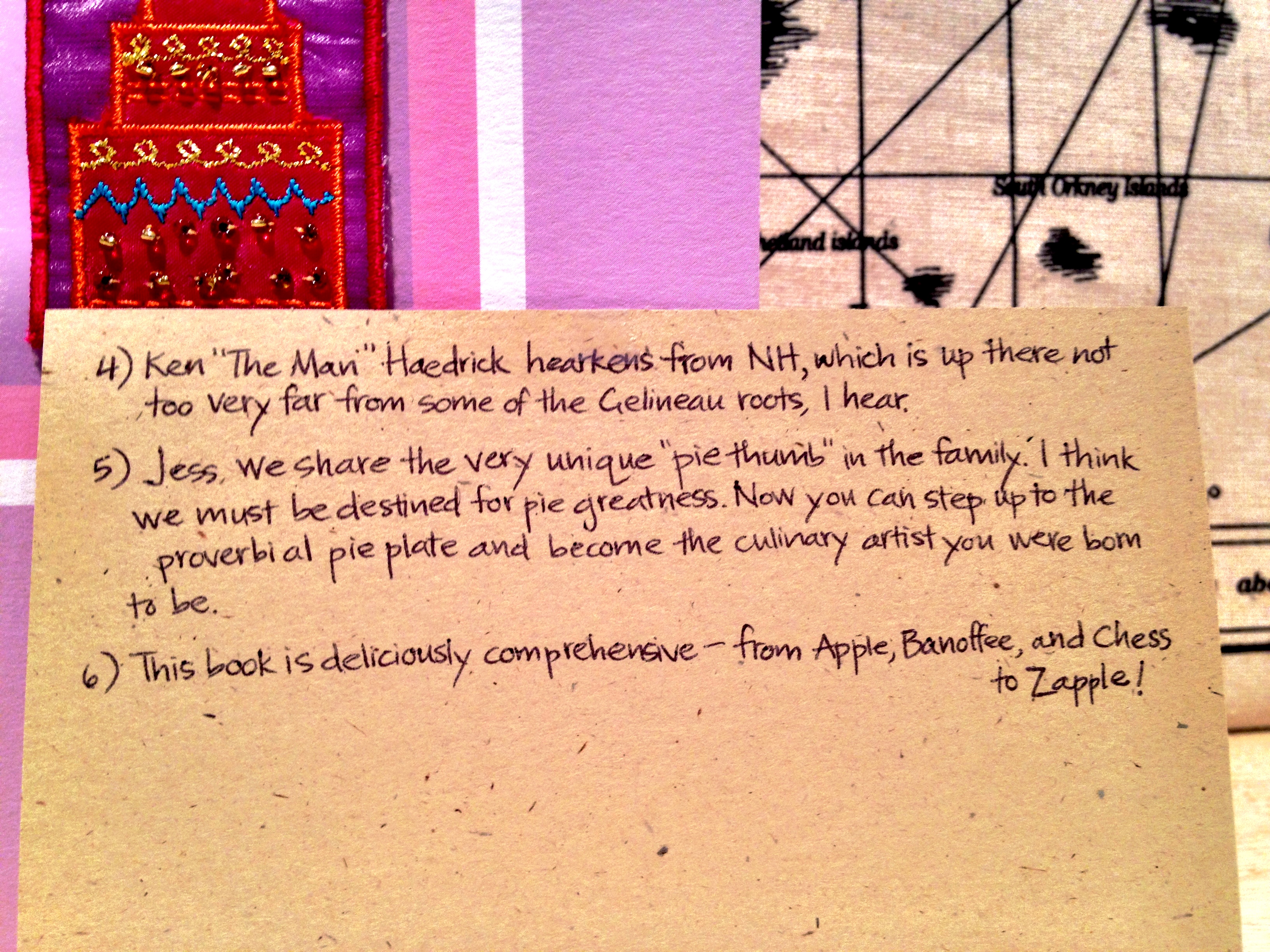 The other day, I found a special wedding card given to me by my cousin Carly and her husband Andrew. The card, while delightful, was not the part I was most excited to reread…it was the index card that she slipped inside the envelope. On it, Carly had listed all the reasons why her gift (Ken Haedrich’s Pie) simply HAD to be mine. Seventy-some pies into this venture, I’d say her reasoning was sound.