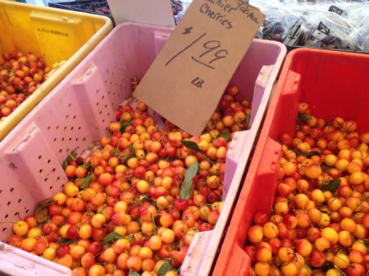 Rainier cherries are sweet, peachy, red-and-yellow marbles of deliciousness. And if you go to a local Washington market (NOT a supermarket), you will get a great price such as $1.99 a lb. I should have bought about twice as many as I did. Regrets.