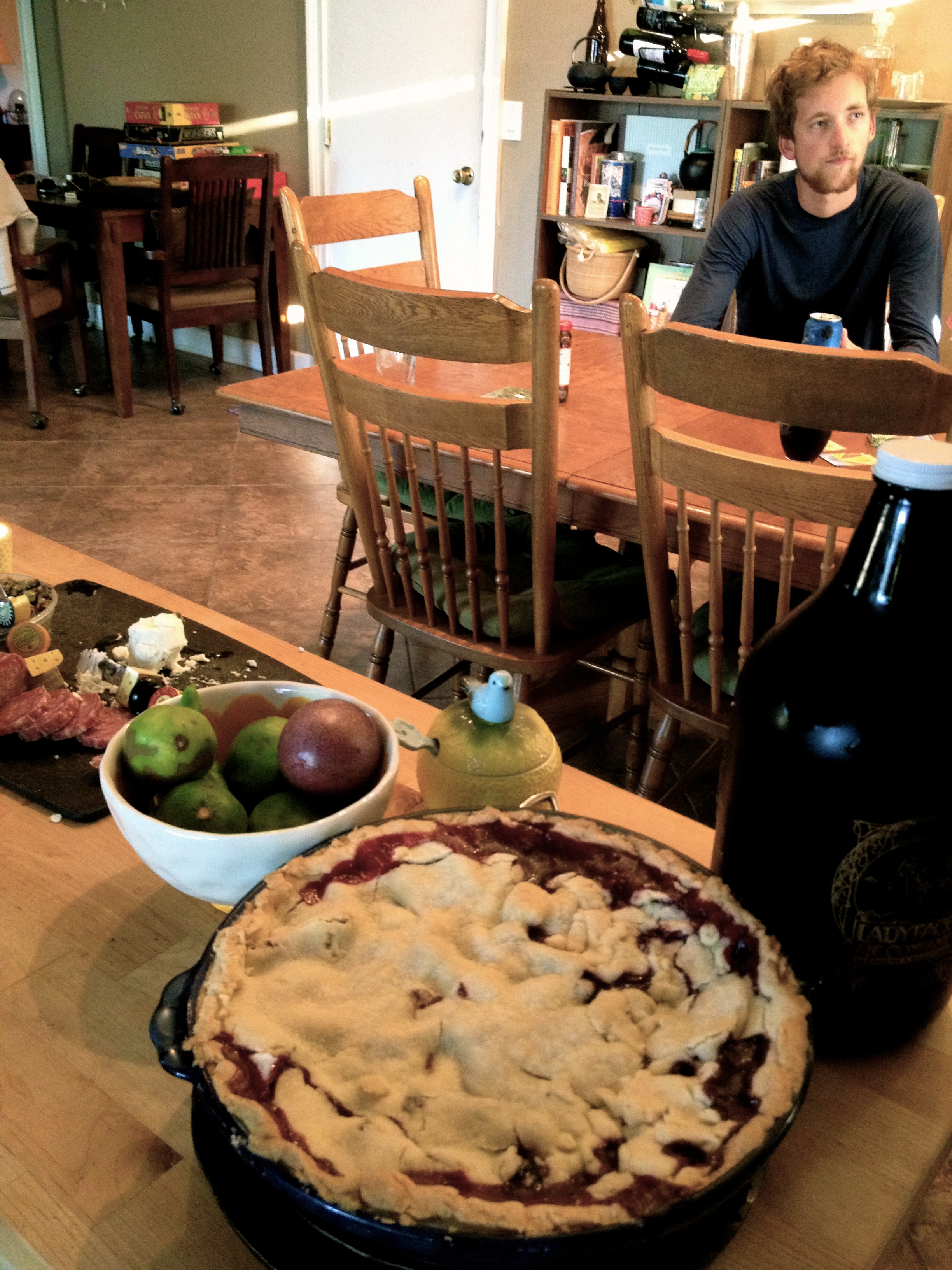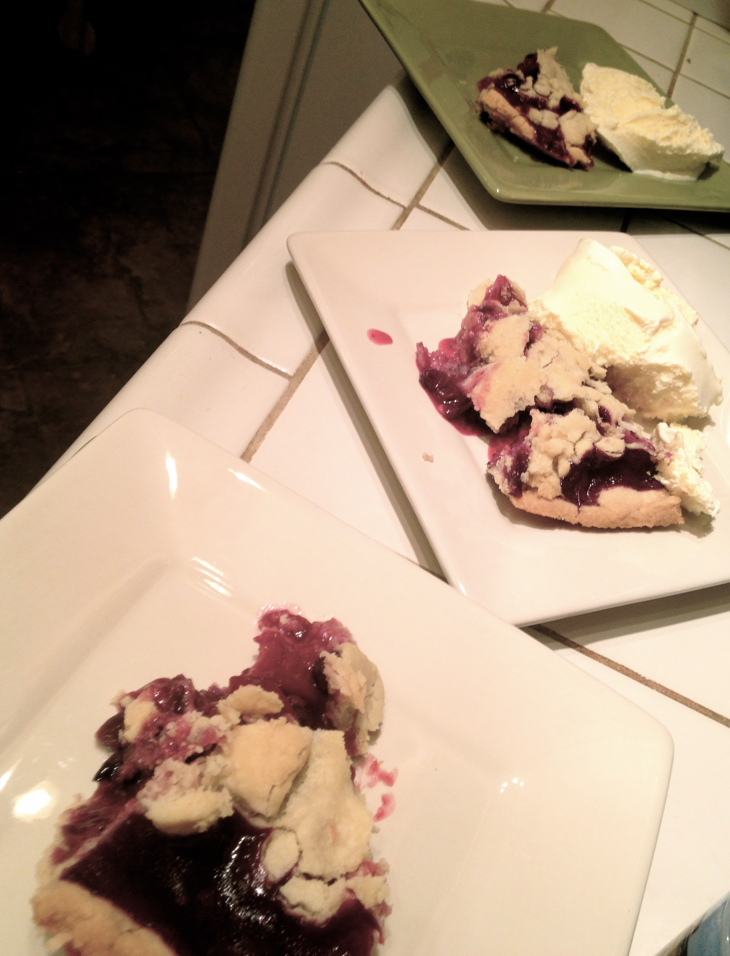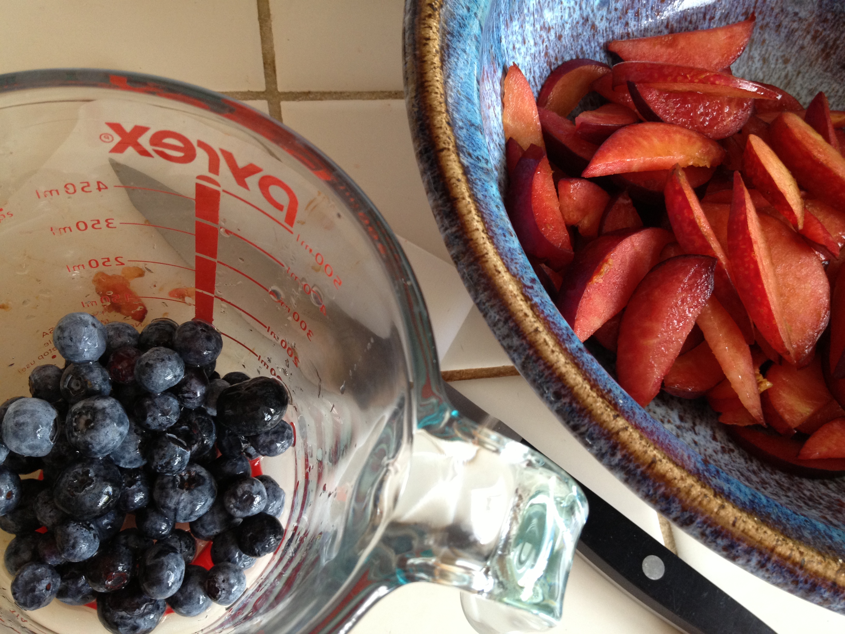 I didn’t use a recipe for the filling in this pie; I had lots of pluots from my in-laws’ tree (along with bear, another truly Californian ingredient) and mixed them with blueberries.