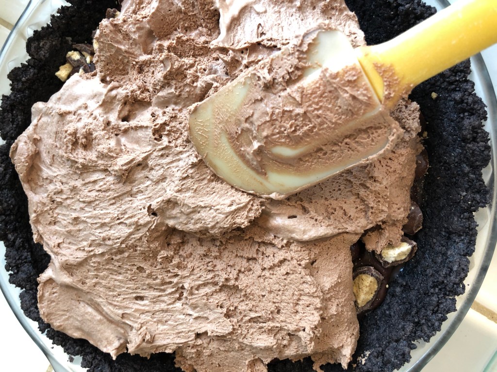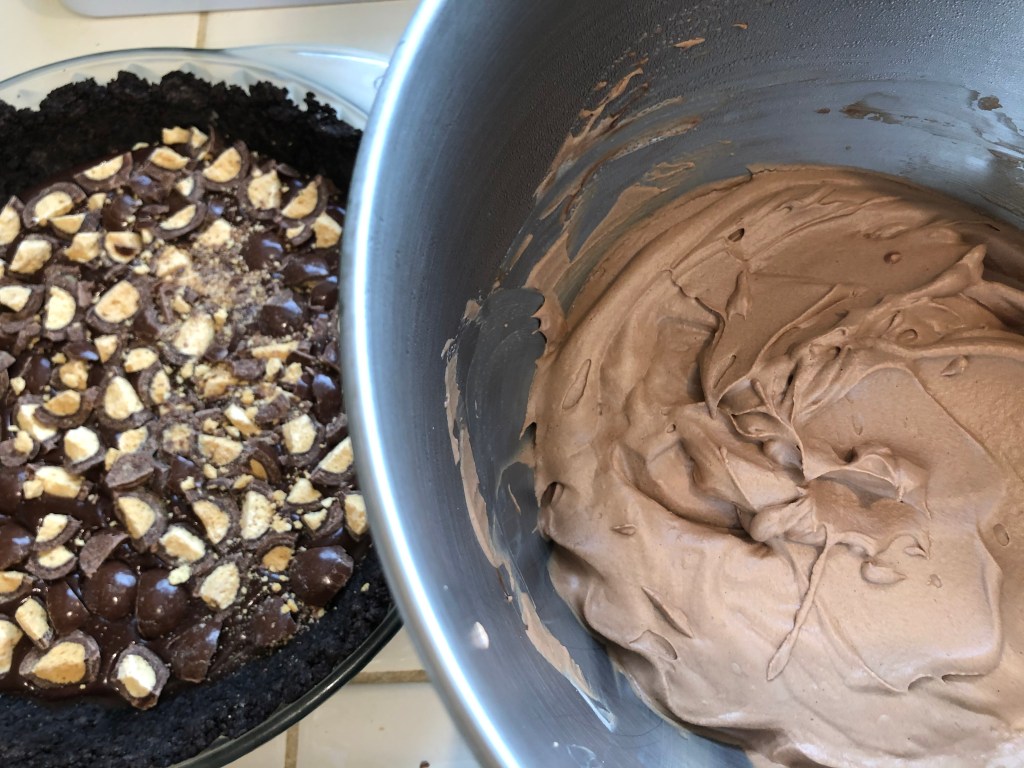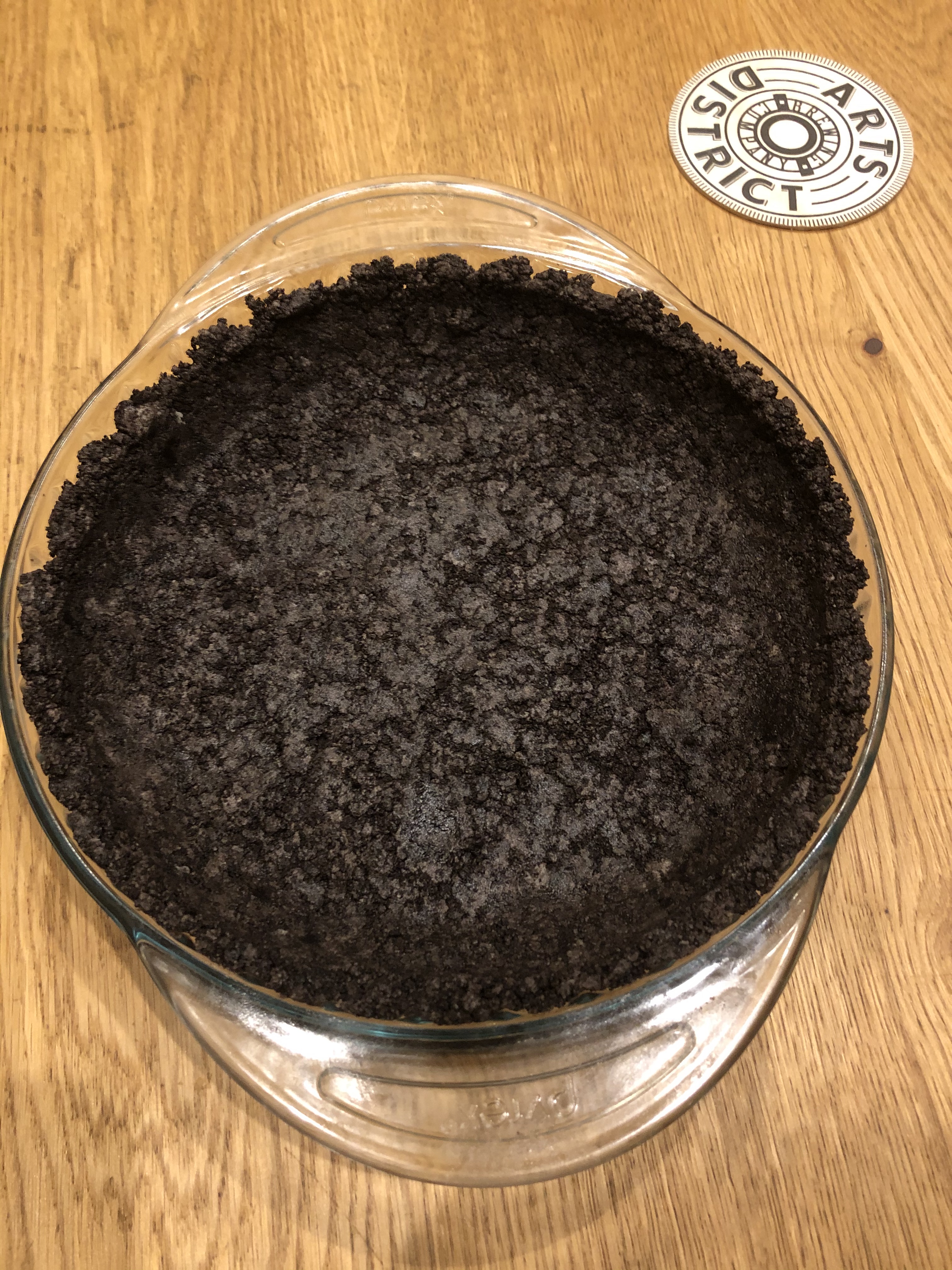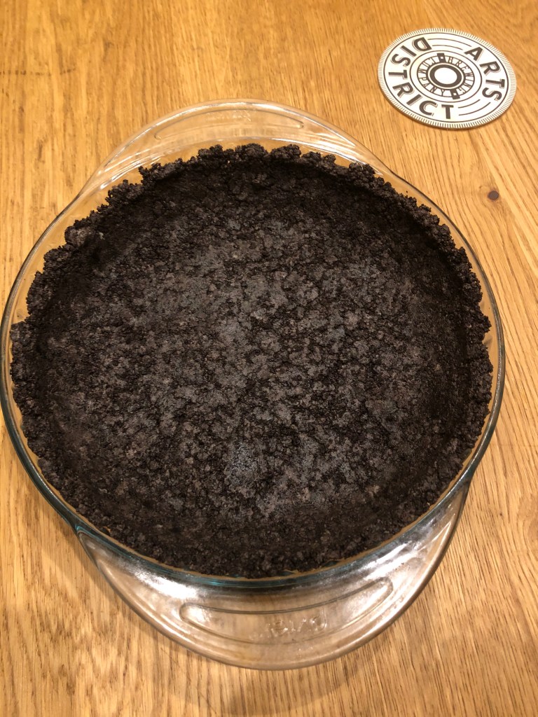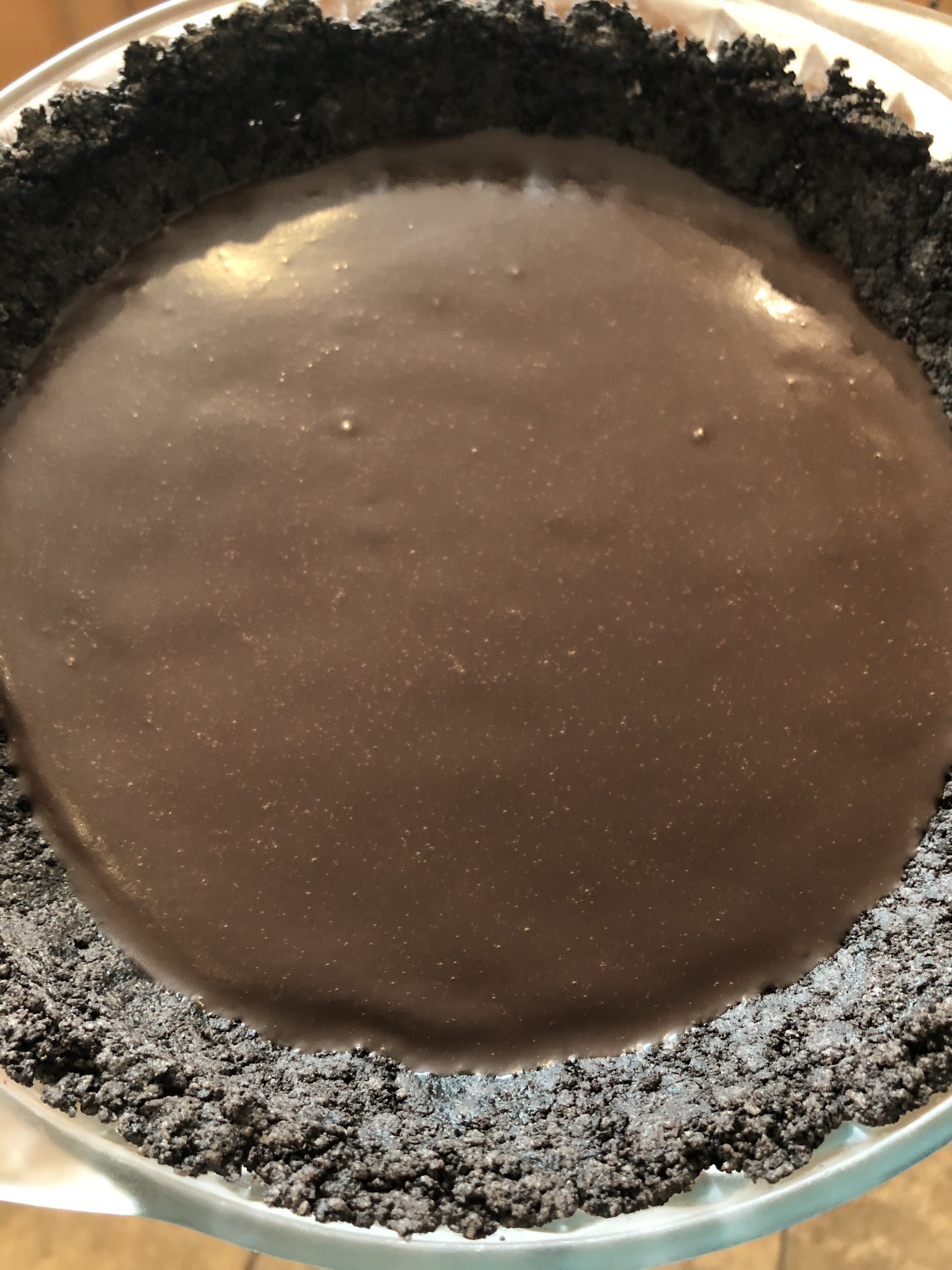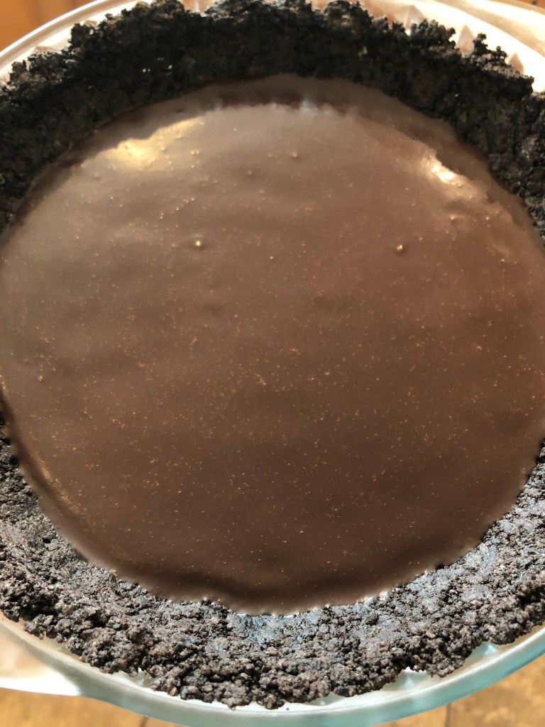 First step: as you might expect for such a chocolatey pie, an “Oreo” crust is laid down, baked and cooled.