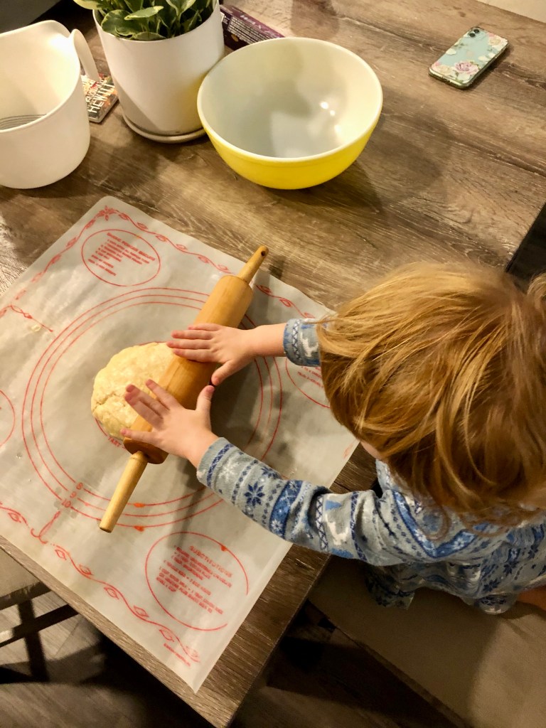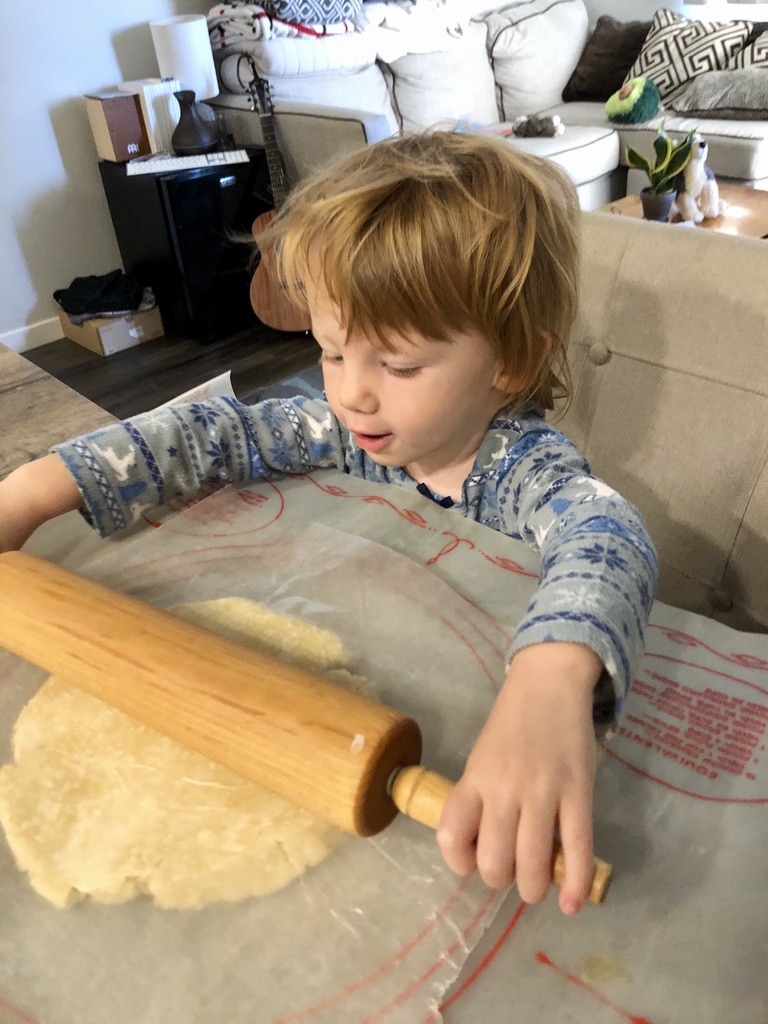 She is getting PRETTY good with a rolling pin, I will not lie. And check out this nifty pie rolling mat! Another embarrassing confession-from-a-pie-maker to add to the list in this post; I’ve never even seen one of these baking mats or surmised their existence. What a fantastic invention. And what fantastic bedhead.