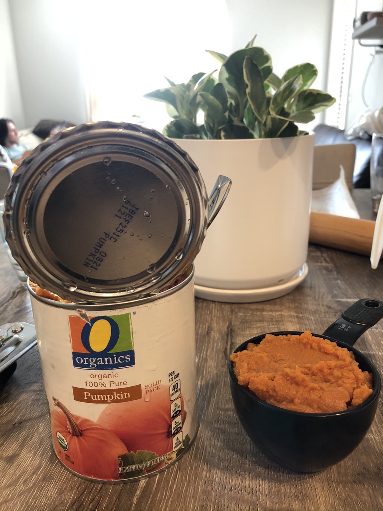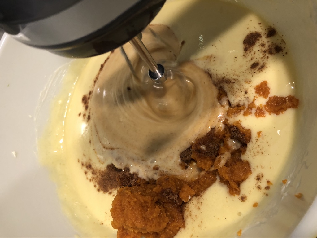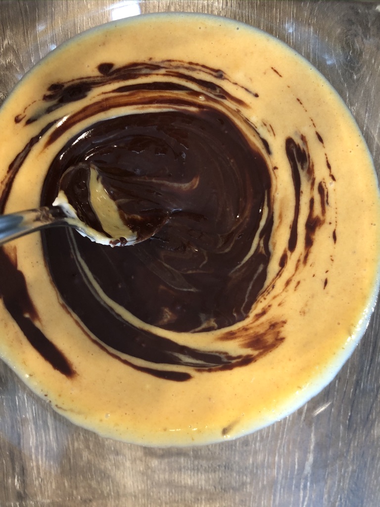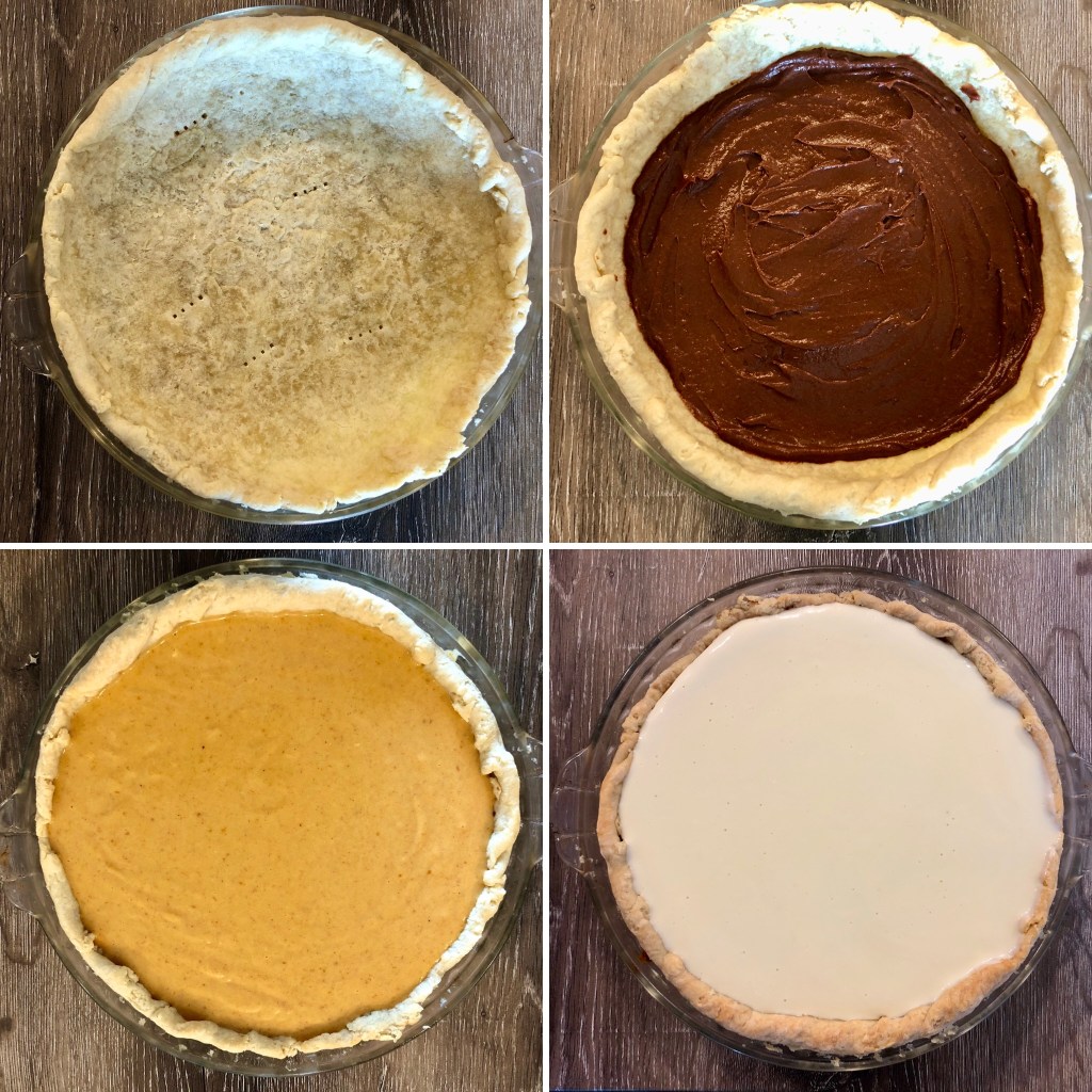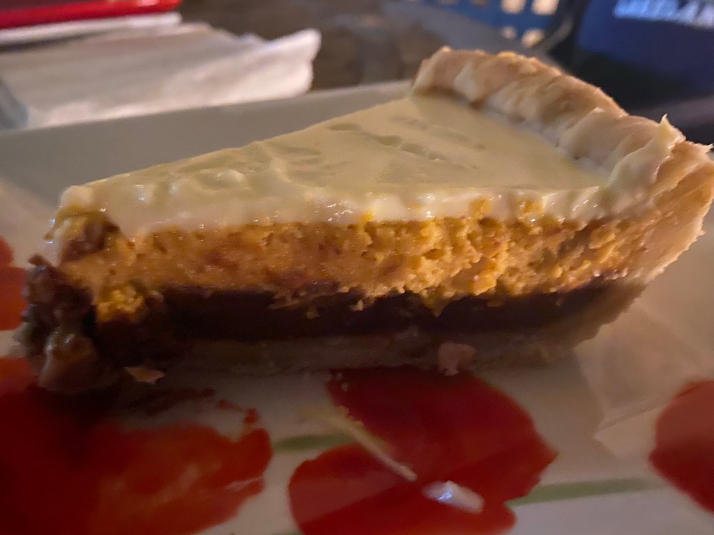 The chocolate layer of the pie is the same cheesecake-y pumpkin filling shown above, just with melted chocolate added.