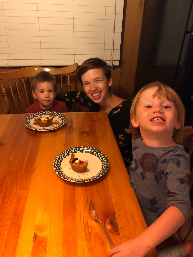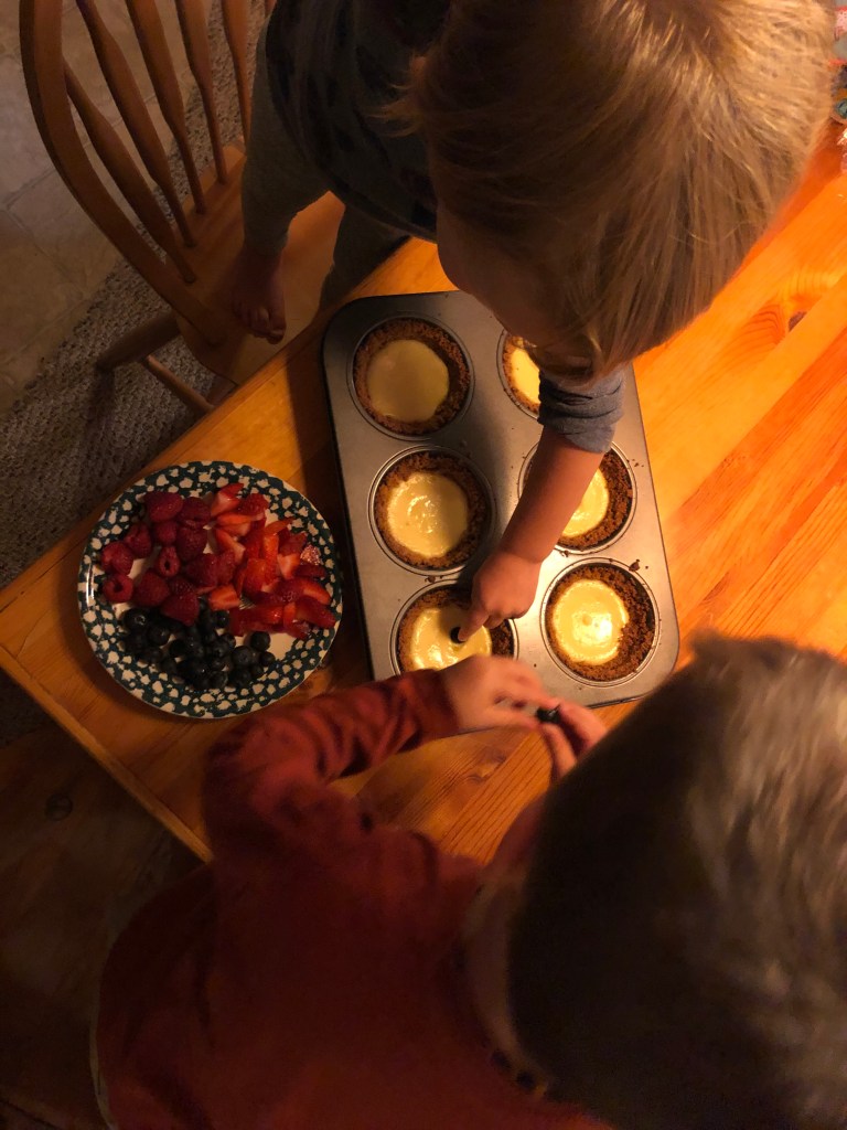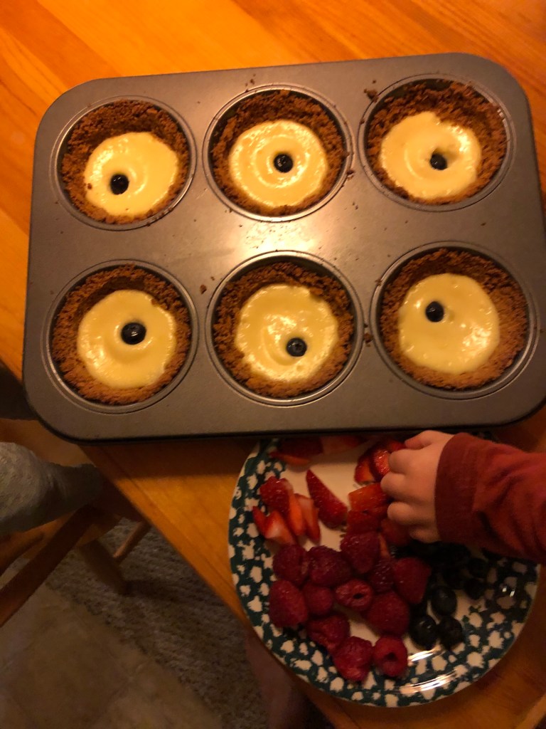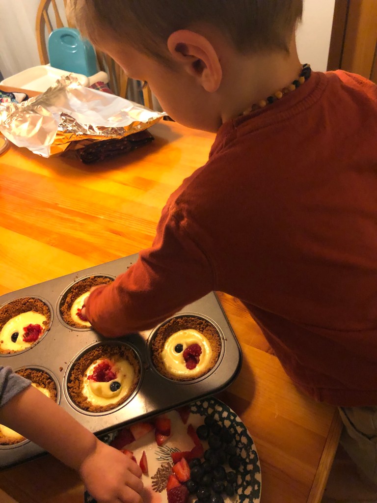 However, I do highly suggest this as a recipe to make (in part or full, depending on their age) with your kids, if you’re looking for delicious family bonding activities. Here’s what your mini cheesecake pies will look like this if you let a pair of enthusiastic two-year-olds decorate them.