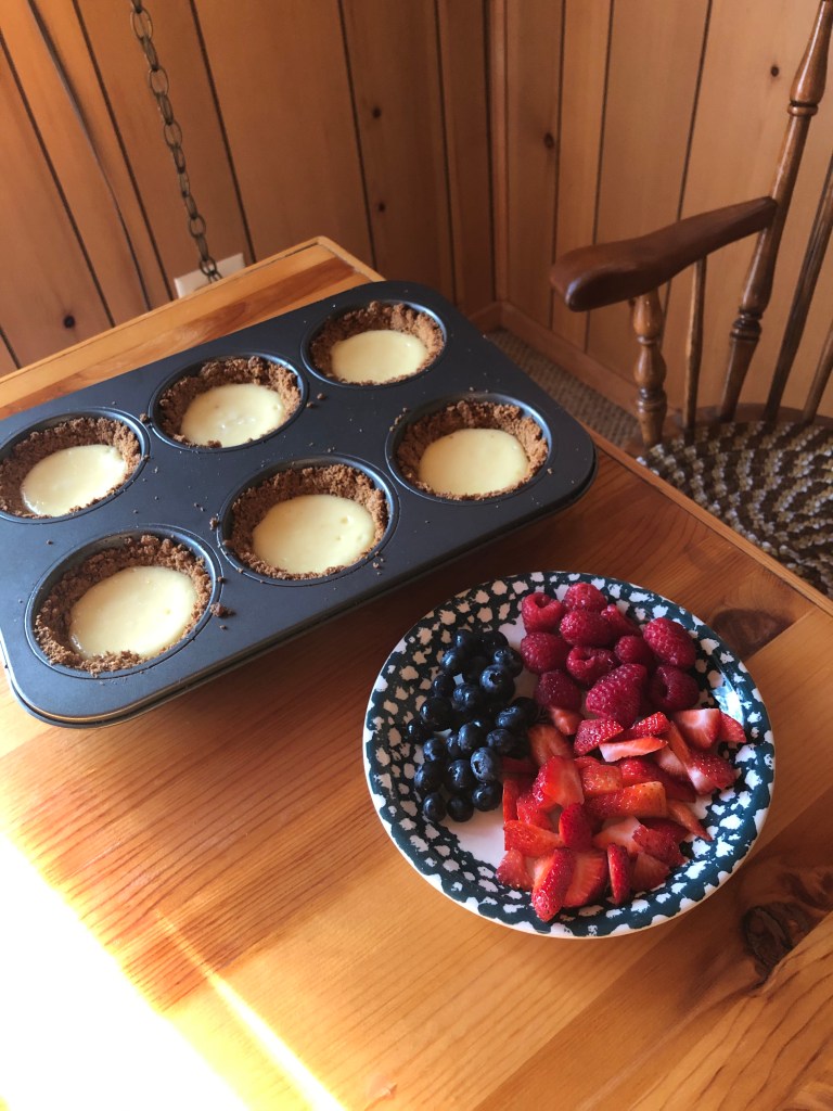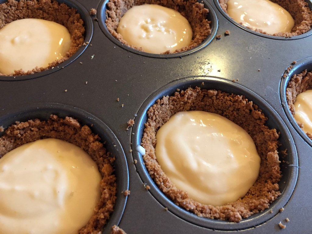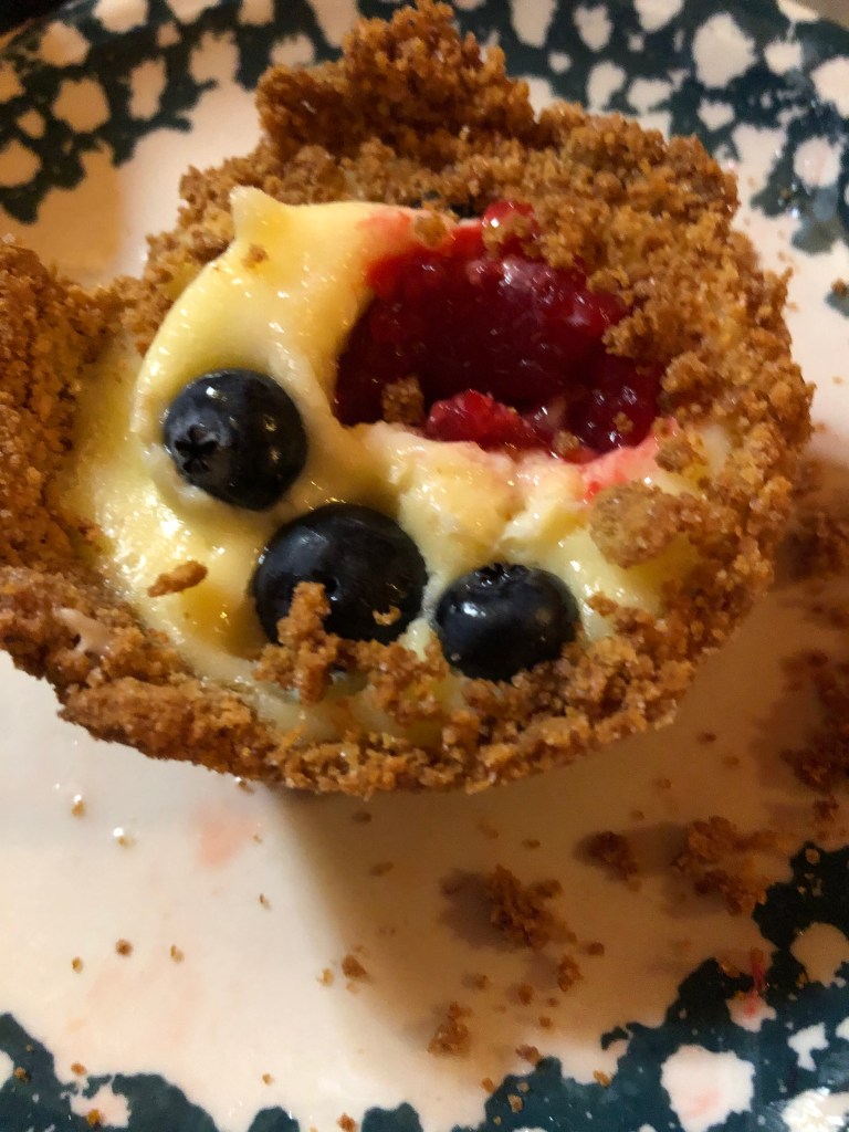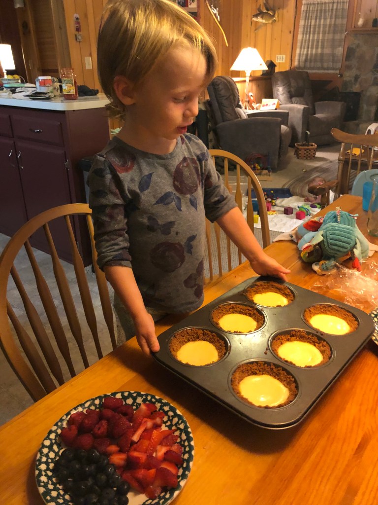 However, I do highly suggest this as a recipe to make (in part or full, depending on their age) with your kids, if you’re looking for delicious family bonding activities. Here’s what your mini cheesecake pies will look like this if you let a pair of enthusiastic two-year-olds decorate them.