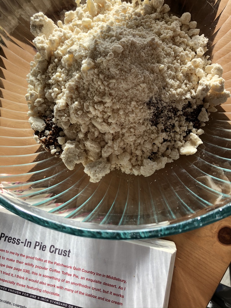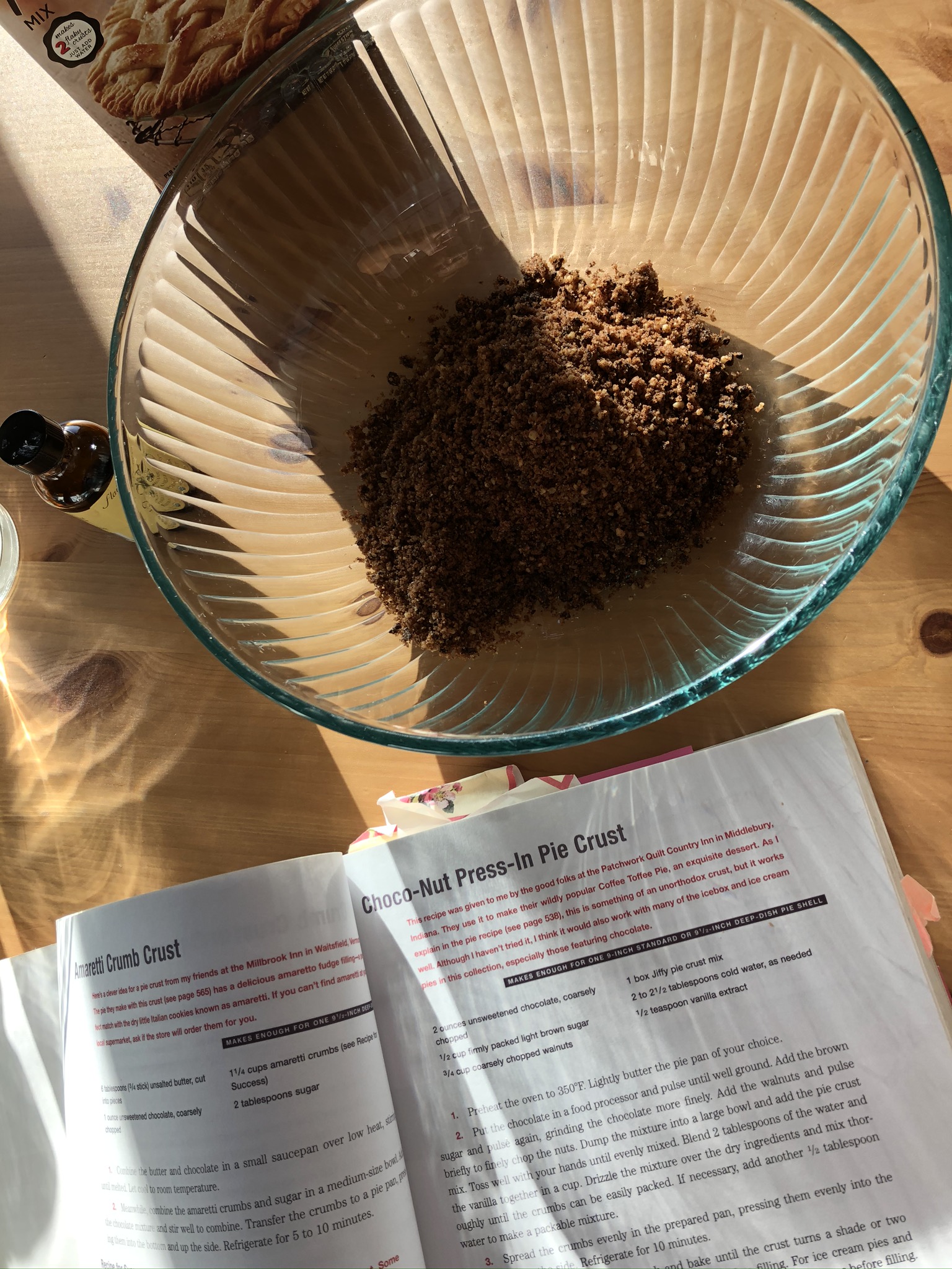 The pie in question is the…Patchwork Quilt Country Inn Frozen Coffee Toffee Pie. Even the name is a mouthful. Let’s talk about the crust first. This pie gets its own particular crust: Choco-Nut Press-In Pie Crust, which Ken comments is an “unorthodox crust” that would likely work well with many of the other icebox and ice cream pies in the Pie cookbook, “especially those featuring chocolate”.