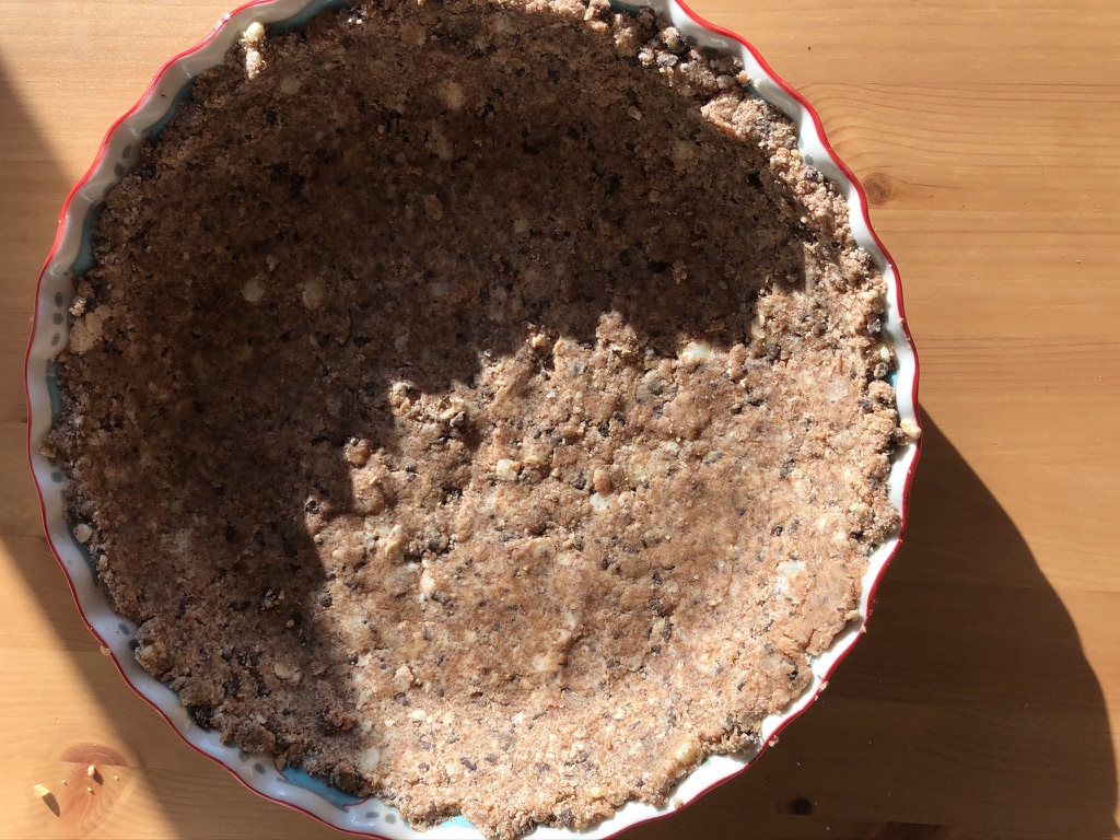 Having made that snide remark: the crust really came together nicely, was easy to work with, and tasted like something special. Here it is, pressed into the largest pie plate I own. Following this, the crust was refrigerated, then baked, then refrigerated again.
