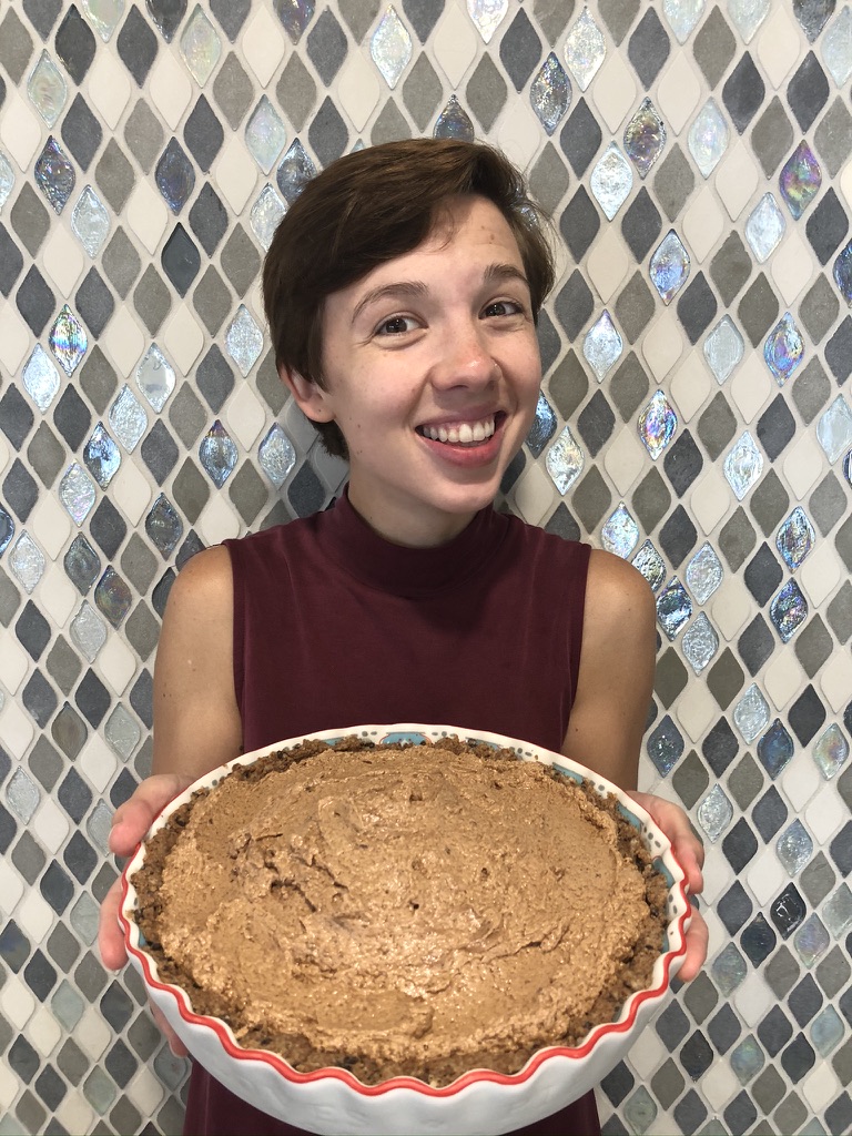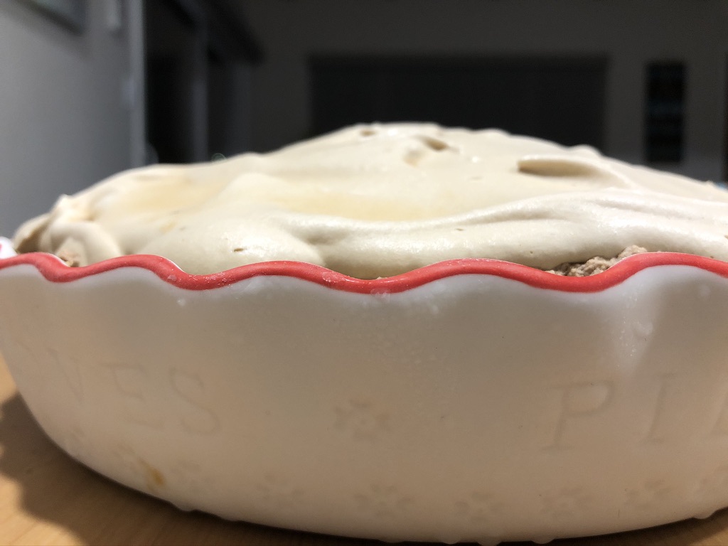 The filling is refrigerated in the already cold pie shell before a topping gets added. Here I am with an expression that says, “lol now I’ve seen it all”.
